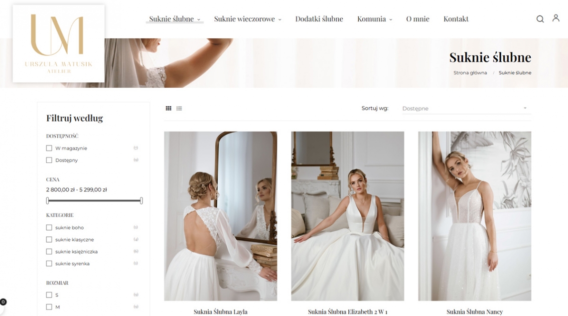 Sklep Atelier Urszula Matusik prezentuje ofertę ekskluzywnych sukien ślubnych i wieczorowych – projekt łączy elegancki design z intuicyjną strukturą kategorii (boho, syrenka, klasyka itd.). Dzięki wyraźnej typografii, estetycznym fotografiom i przejrzystej nawigacji użytkownicy mogą szybko zapoznać się z ofertą, dodatkami oraz skontaktować się z pracownią.