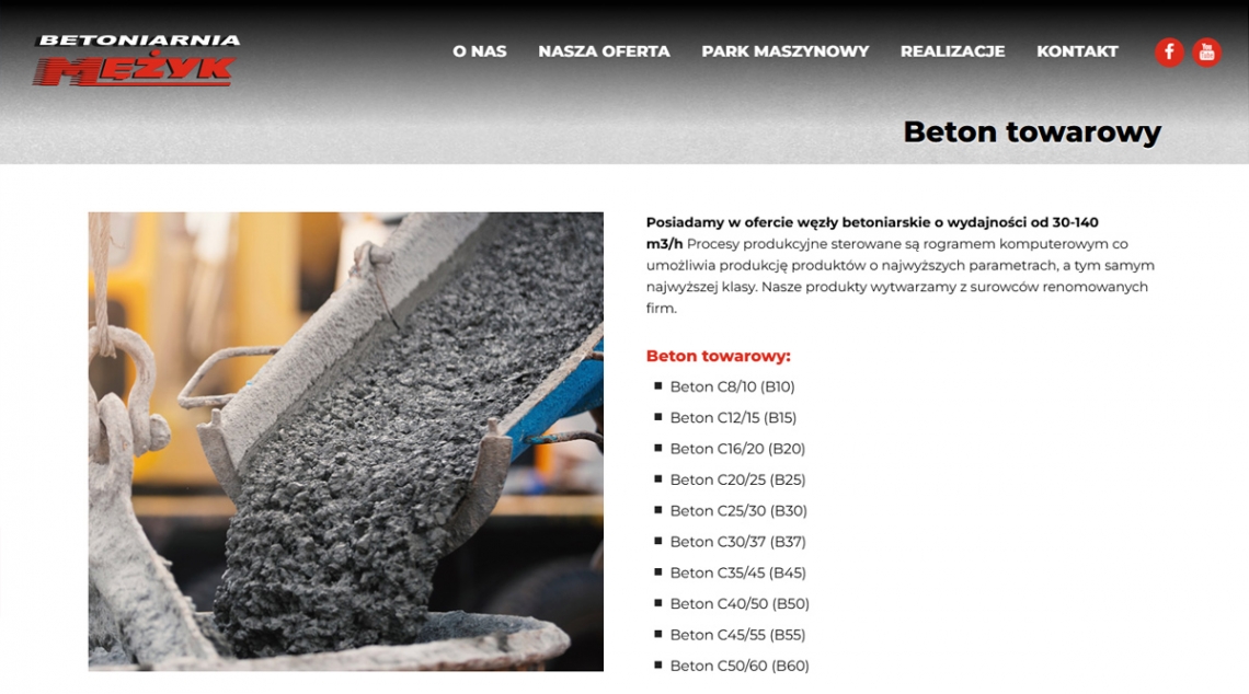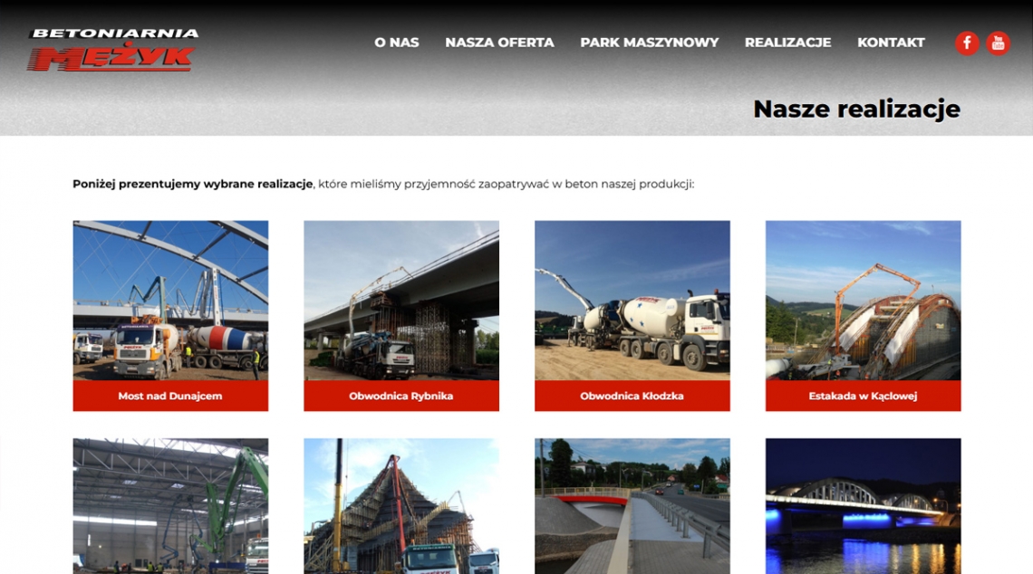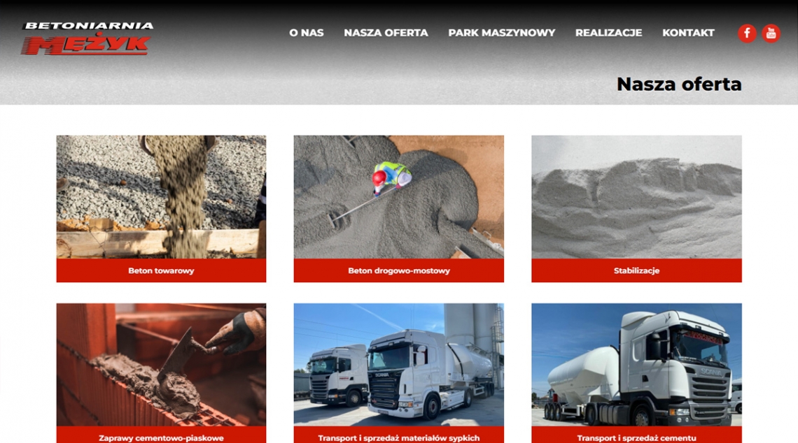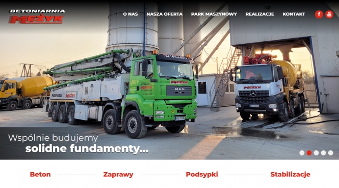 Strona Meżyk Beton to wizytówka profesjonalnej betoniarni z Nowego Sącza — łączy ofertę betonu towarowego, betonów drogowo-mostowych, stabilizacji i zapraw z prezentacją parku maszynowego oraz realizacji. Dzięki czytelnej strukturze, dopracowanej wizualizacji i informacjom o produkcji z wykorzystaniem zaawansowanych technologii (sterowanie komputerowe) projekt buduje wiarygodność i wizerunek eksperta w branży.