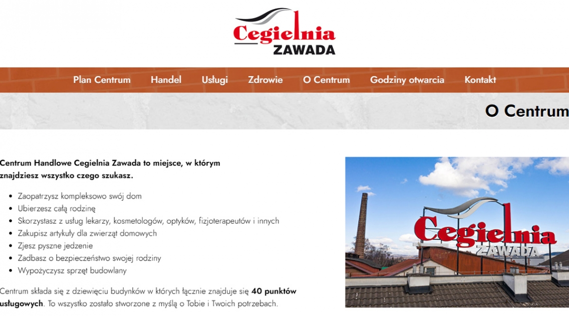 Strona Cegielnia Zawada prezentuje nowoczesne centrum handlowe osadzone w historycznym kontekście — łączy przeszłość cegielni z funkcjonalną strukturą dla najemców i odwiedzających. Projekt akcentuje ofertę handlową, usługową i zdrowotną za pomocą czytelnego menu, aktualności oraz atrakcyjnej oprawy wizualnej — wzmacniając tożsamość miejsca z tradycją.