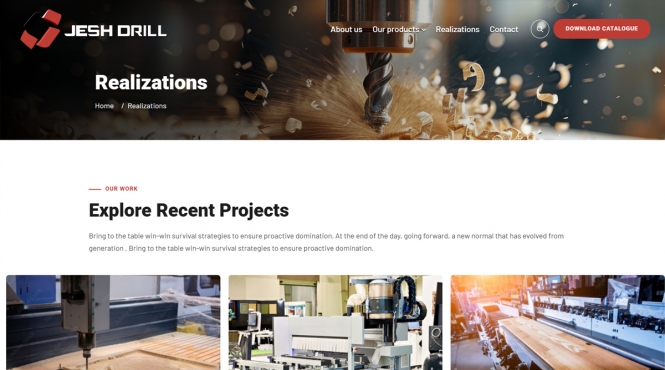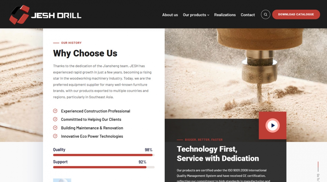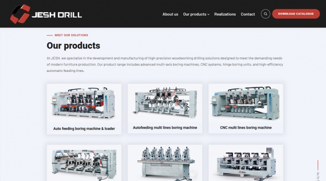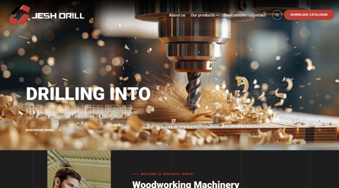 Strona Jesh Drill Europe to nowoczesny serwis dla producenta maszyn wiercących do obróbki drewna, który łączy techniczne informacje (specyfikacje urządzeń, certyfikaty) z przejrzystą prezentacją oferty i realizacji. Projekt akcentuje innowacyjność, rzetelność i międzynarodowy charakter firmy działającej w branży maszyn CNC.