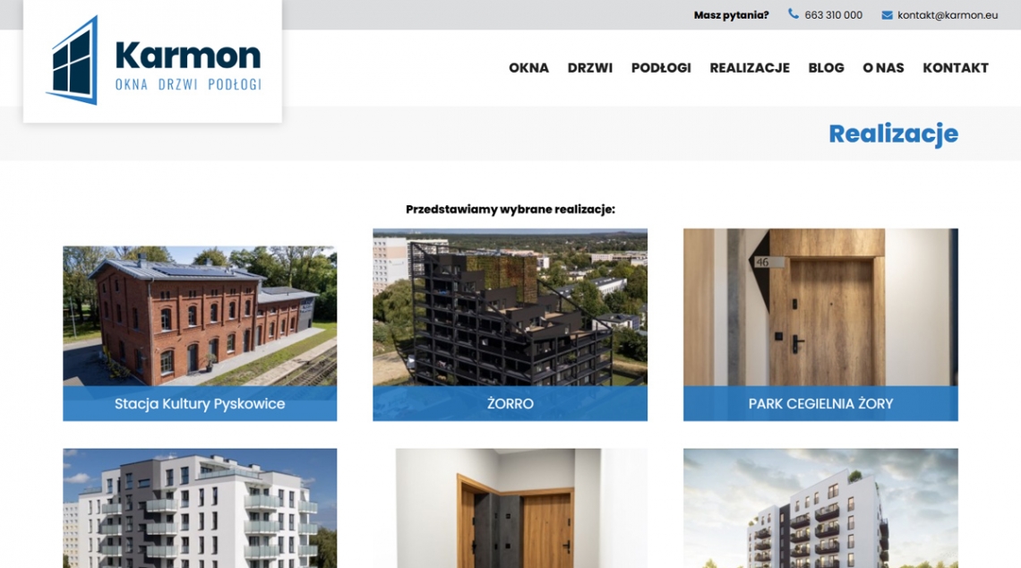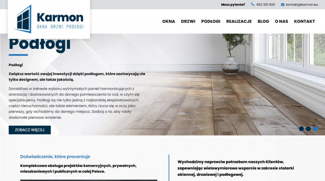 Strona Karmon to elegancki i funkcjonalny serwis firmy specjalizującej się w stolarki okiennej, drzwiowej oraz podłogach — prezentujący ofertę, usługi montażu i doradztwa w czytelny sposób. Projekt stawia na estetyczny minimalizm, intuicyjne menu (Okna, Drzwi, Podłogi) oraz galerię realizacji, co wzmacnia wizerunek marki jako solidnego partnera w projektach budowlanych.