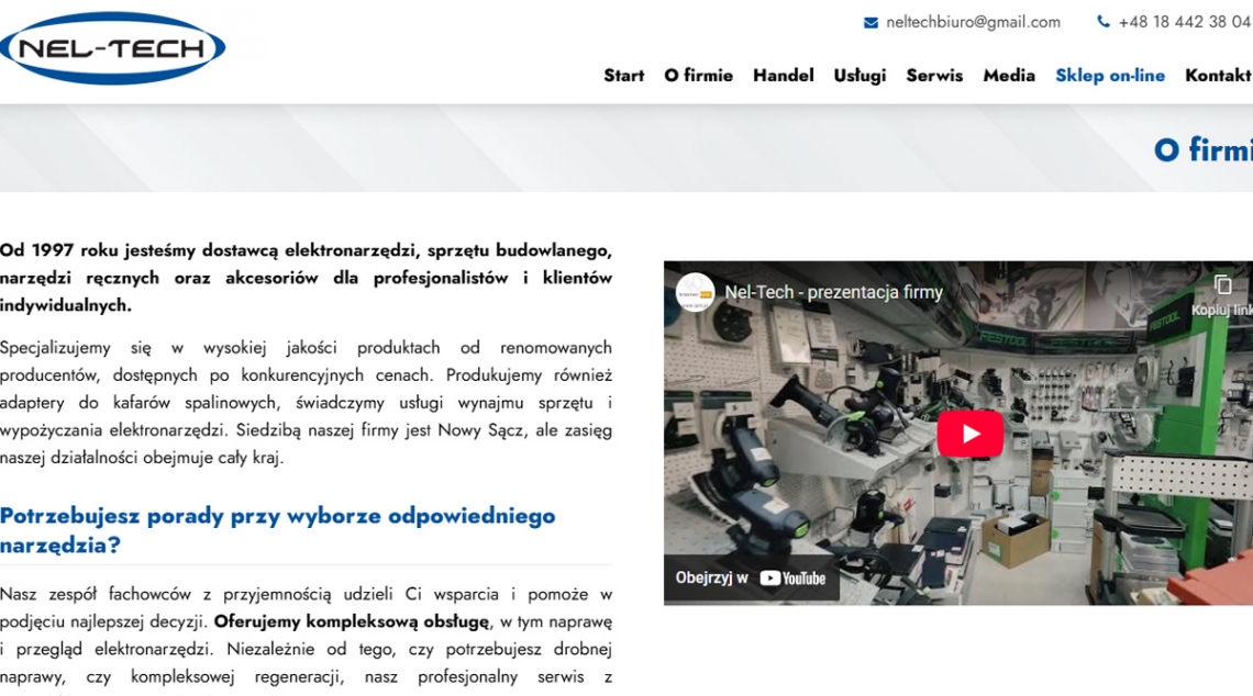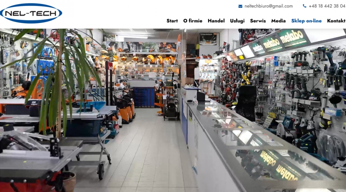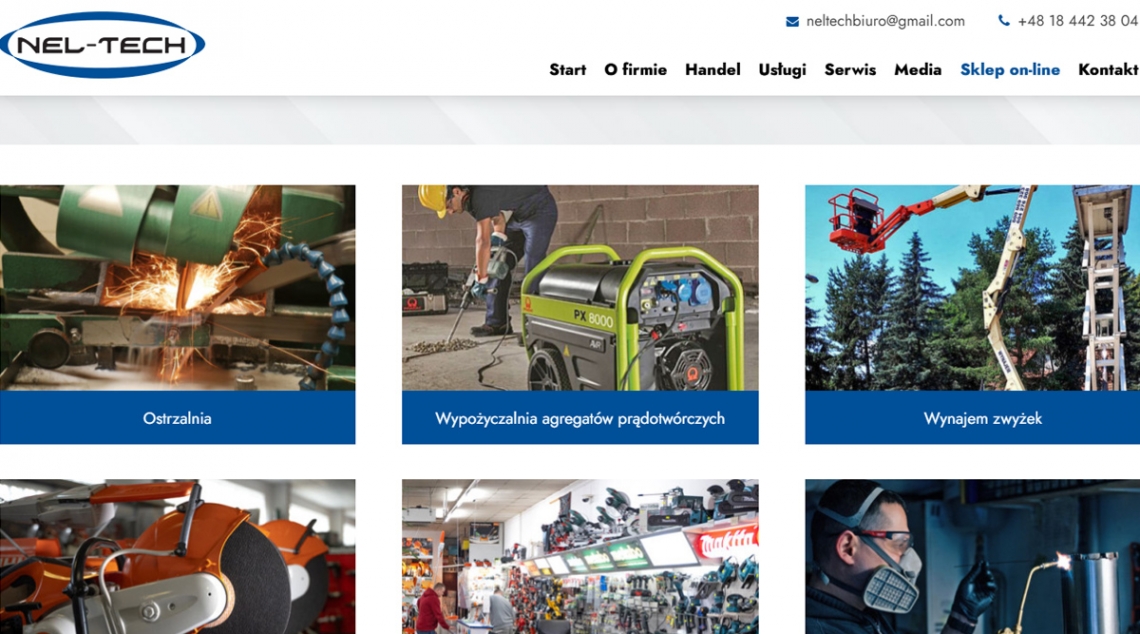 Strona Nel-Tech to funkcjonalny serwis dla firmy z branży narzędzi i sprzętu budowlanego — łączący rozbudowaną ofertę (handel, wypożyczalnia, serwis) z prostą i przejrzystą prezentacją kategorii produktowych. Projekt stawia na intuicyjną nawigację, czytelne menu i logiczne podziały, dzięki czemu użytkownik szybko znajdzie potrzebne urządzenie, usługę lub informację o regeneracji narzędzi.