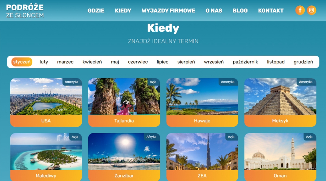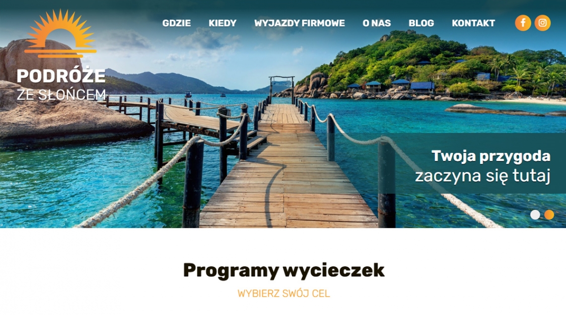Strona Podróże ze Słońcem to barwna platforma biura podróży, która łączy emocje, ofertę wycieczek i intuicyjną obsługę rezerwacji w jednym miejscu. Dzięki przejrzystej strukturze (destynacje, oferty sezonowe, filtry cenowe), inspirującym zdjęciom i czytelnej prezentacji szczegółów wakacji — użytkownik szybko znajdzie idealny wyjazd i dokona rezerwacji.