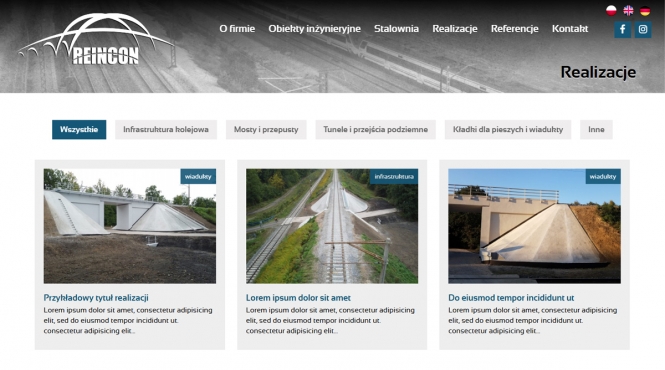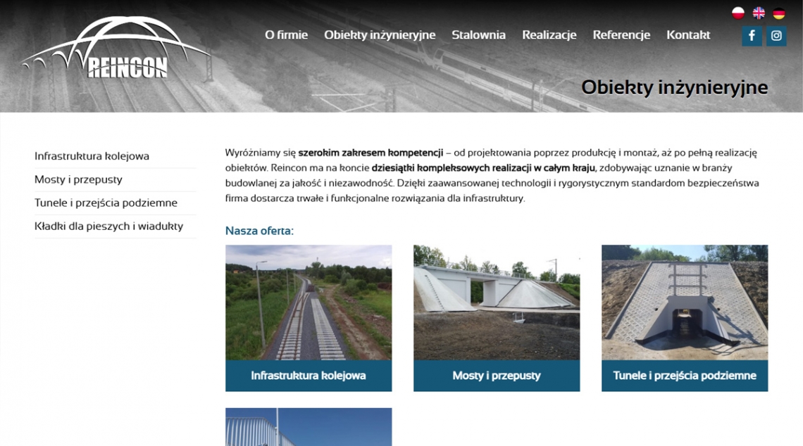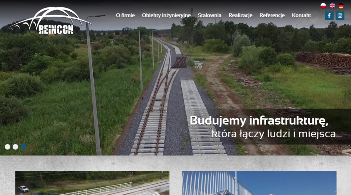 Strona Reincon to solidna wizytówka firmy działającej w sektorze infrastruktury inżynieryjnej — projekt skupia się na prezentacji obiektów inżynieryjnych (mosty, wiadukty, tunele, kładki) oraz konstrukcji stalowych. Dzięki czytelnej strukturze „O firmie / Obiekty inżynieryjne / Stalownia / Realizacje / Referencje”, profesjonalnej estetyce i podkreśleniu doświadczenia, witryna wzmacnia wizerunek Reincon jako kompetentnego, kompleksowego wykonawcy inwestycji technicznych.