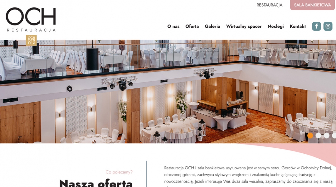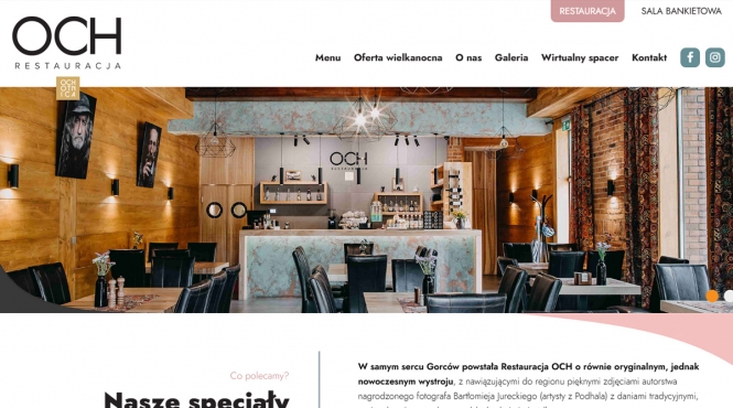 Strona Restauracja OCH to atrakcyjna wizytówka dla lokalu z Ochotnicy, łącząca ofertę restauracji i sali bankietowej z elementami lokalnego charakteru (regionalne fotografie, mural) i intuicyjną strukturą menu, galerii, rezerwacji. Projekt kładzie nacisk na przyjazną obsługę, dekoracyjny wyraz i łatwy dostęp do informacji o imprezach okolicznościowych, menu oraz kontakcie.