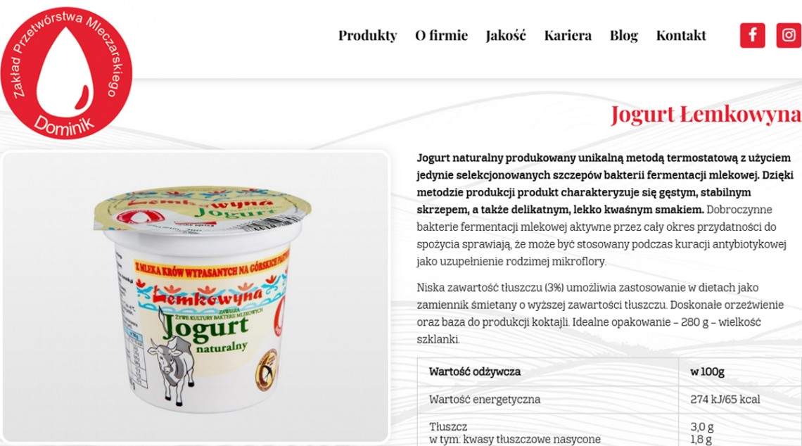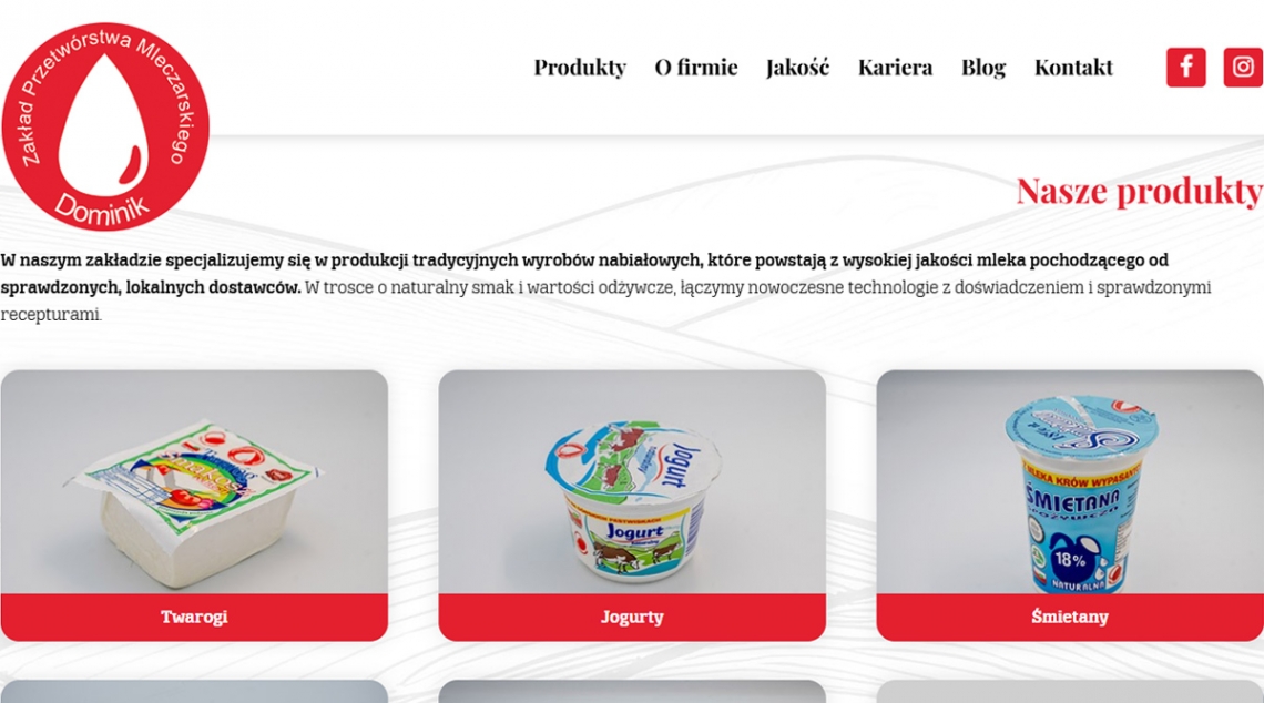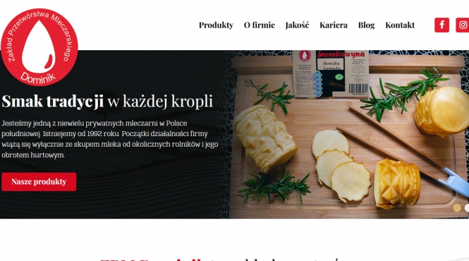 Strona ZPM Dominik prezentuje zakład przetwórstwa mleczarskiego z Nowego Sącza poprzez połączenie tradycji i nowoczesności — akcentując lokalne składniki, wysoką jakość produktów i szeroką ofertę (mleko, śmietany, twarogi, kefiry). Funkcjonalność strony wspiera łatwe odnalezienie katalogu produktów, wartości firmy oraz danych kontaktowych, wzmacniając profesjonalny i rzetelny wizerunek marki.